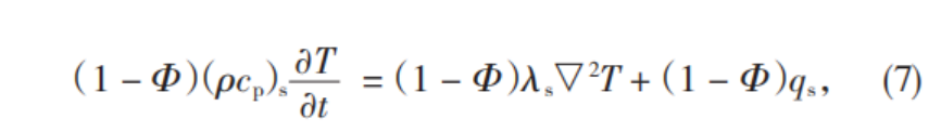 兩種能量增加帶來的溫升是基于多孔介質(zhì)材料內(nèi)的固體部分。假設(shè)固體部分的密度表示為ρs,其比熱容表示為cs。假定研究對象熱物性參數(shù),如比熱容、導(dǎo)熱系數(shù)等,不受到時間和空間改變帶來的影響,多孔介質(zhì)本身始終為各項同性的,并且多孔介質(zhì)材料內(nèi)部細小孔隙的容積均被流體填充,則有: