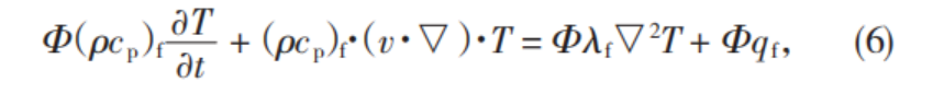 式(6)—式(7)中,ρ為密度,kg/m3;cp為比熱容,J(/kg·K);(ρcp)f為多孔介質(zhì)流相中總的體積比熱容,J/m3;T為溫度,K;t為時間,s;λf為液體導(dǎo)熱系數(shù),W(/m·K);qf為液體內(nèi)熱源強度,W;(ρcp)s為多孔介質(zhì)固相中總的體積比熱容,J/m3。將式(6)與式(7)相加,可導(dǎo)出單相流體的多孔介質(zhì)的能量方程為: