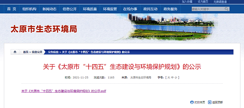 近日,太原市生態(tài)環(huán)境局在其官網(wǎng)發(fā)布了關(guān)于《太原市“十四五”生態(tài)建設(shè)與環(huán)境保護(hù)規(guī)劃》(下文簡(jiǎn)稱《規(guī)劃》)的公示。