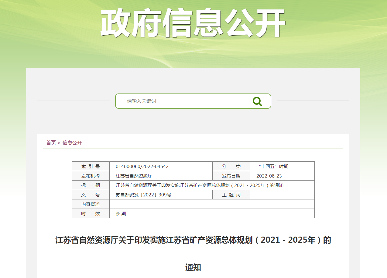 地大熱能地熱能開發(fā)利用:《江蘇省礦產(chǎn)資源總體規(guī)劃(2021-2025年)》(以下簡稱《規(guī)劃》)業(yè)經(jīng)自然資源部批準,并經(jīng)江蘇省政府同意,近日印發(fā)。