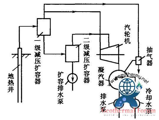 圖2是多級閃蒸(多級減壓擴(kuò)容)蒸氣循環(huán)的流程圖。從井口流出的熱水先進(jìn)入第一級減壓擴(kuò)容器,產(chǎn)生的蒸氣進(jìn)入汽輪機(jī)的高壓部分,而從第一級閃蒸器底部出來的閃蒸后的剩余熱水再進(jìn)入第二級閃蒸器(擴(kuò)容器),產(chǎn)生二次閃蒸蒸氣,并通往汽輪機(jī)低壓部分做功。若井口出來的是濕蒸氣,則直接進(jìn)入汽水分離器,蒸氣分離出來后去高壓部分做功,熱水再進(jìn)入第二級閃蒸器(減壓擴(kuò)容器),所以實(shí)際上是用一個汽水分離器代替了第一級閃蒸器,如(圖1-b)所示。第二級閃蒸器分離出來的熱水壓力若高于大氣壓力,則熱水可以自行排出;不然,就要用排水泵抽出。閃蒸器的級數(shù)增加,單位質(zhì)量工質(zhì)輸出功也增加,即地?zé)崴?/a>中的能量愈能得到充分利用。當(dāng)級數(shù)無限多時,理論上可以得到最大的輸出功,增益達(dá)到極限。但是,級數(shù)增加將使設(shè)備投資增加,系統(tǒng)變得復(fù)雜,所以實(shí)際采用的閃蒸級數(shù)一般不超過四級。地?zé)崃黧w溫度高可以級數(shù)多些,熱水溫度較低時就不宜采用二級以上的閃蒸系統(tǒng)。
