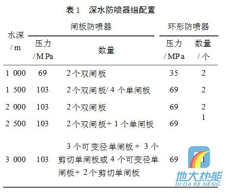 水下防噴器是海洋石油鉆采過程中用于防止井噴發(fā)生的專用設(shè)備,上部連接隔水管裝置,下部連接海底井口裝置。深水防噴器組通常有5個(gè)閘板和2個(gè)萬能防噴器組成,第5個(gè)閘板即底閘板可以剪斷套管,套管剪切閘板位于盲板的下部,以便在剪斷套管后可以關(guān)井,通常在套管可能遇卡或者鉆井裝置需要應(yīng)急脫離時(shí)會(huì)用到。2個(gè)萬能防噴器是冗余設(shè)計(jì)的需要,上部萬能防噴器作為井控的主要手段。根據(jù)水深的不同,深水防噴器組通常有不同的配置。表1是在總結(jié)Transocean公司所有不同水深典型鉆井船防噴器組配置情況得出的,可以作為深水鉆井防噴器組配置的參考。 對(duì)于浮式鉆井裝置(半潛式平臺(tái)或鉆井船),選用防噴器系統(tǒng)的通徑為?476.3mm(工作水深<600m)或?425.5mm(工作水深>600m),選用封井壓力為69、103、138MPa時(shí),視工作水深、海底至目的層深度和是否為特殊高壓的油氣層而定。為了適應(yīng)欠平衡鉆井的需要,井口防噴器組合要配置高壓旋轉(zhuǎn)防噴器,即隨鉆壓力控制系統(tǒng)PCWD(Pres2sureControlWhileDrilling)。