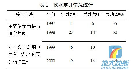 前幾年某單位在水文地質(zhì)領域剛起步,經(jīng)驗不足,找水主要依靠物探工作,片面追求效率,急于求成,效果很不理想。后來意識到了基巖裂隙水地區(qū)水文地質(zhì)調(diào)查工作的重要性,及時調(diào)整了思路,加強了這方面的工作力度,取得了比較好的結(jié)果。近幾年來基巖裂隙水地區(qū)定井成功率見表1。