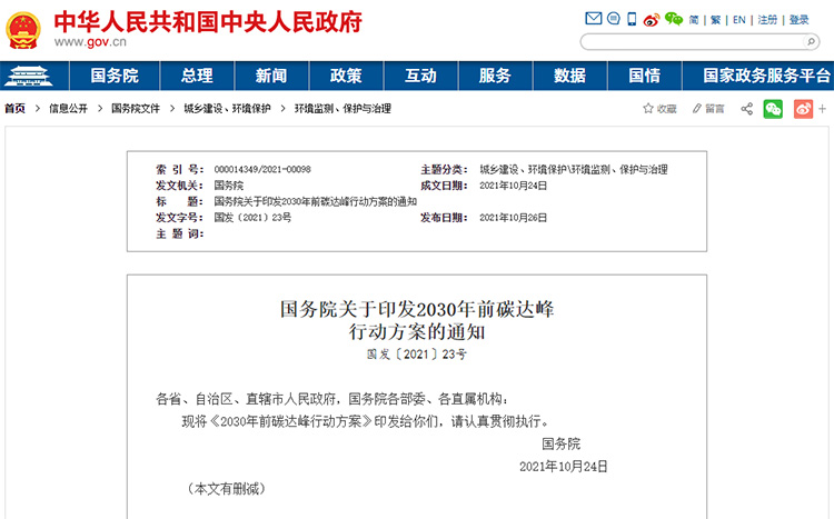國務(wù)院關(guān)于印發(fā)2030年前碳達(dá)峰