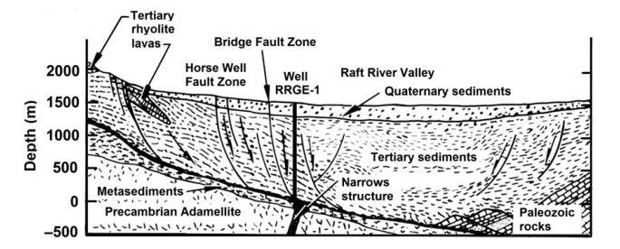 拉夫特河地?zé)崽?/a>的熱儲層,處在一個盆地中,這個盆地西部以一個小角度的斷層為界限,東邊則是由黑松山(Black Pine Mountains)和一個二次斷層分界。熱儲的蓋層為第三系的沉積層,基底巖石大約厚度為1600m,在這個深度被一個東北向的線性構(gòu)造—解理構(gòu)造(Narrows Structure)所貫穿,人們認(rèn)為這個結(jié)構(gòu)是基底剪切作用產(chǎn)生的。熱源為前寒武紀(jì)二長花崗巖。開始,人們認(rèn)為熱液是通解理構(gòu)造涌上來,然后通過其他的褶皺和斷層蔓延整個沉積構(gòu)造?,F(xiàn)在的人們則認(rèn)為有兩個熱源補(bǔ)給區(qū),一個來自西北方向沿著馬井?dāng)鄬臃植嫉难a(bǔ)給區(qū),另外一個則是來自東南方向的,可能是與變窄構(gòu)造有關(guān)聯(lián)。
