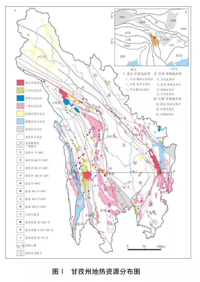據(jù)最新調(diào)查成果,甘孜州的水熱活動強(qiáng)烈,全州共有溫泉點(diǎn)264 個,地?zé)峋?/a>17 口, 除色達(dá)縣外,其余17 縣均有水熱活動。 全州溫泉分布主要受 3 條深大斷裂帶和數(shù)條主要大斷裂(德格-鄉(xiāng)城大斷裂帶、玉科大斷裂帶、 陳支大斷裂帶等)控制,形成了3個主要地?zé)釒?/a>和9個水熱活動集中分布區(qū)的基本分布格局。水熱活動強(qiáng)烈區(qū)一般位于主干斷裂帶及其轉(zhuǎn) 折的部位,以康定縣、甘孜縣、理塘縣、巴塘縣 為典型代表。