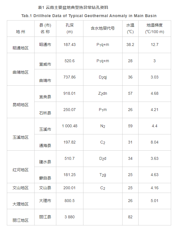 云南中低溫水熱活動區(qū), 主要分布在滇東斷陷盆地中, 水溫相對較低, 但流量大, 共有地?zé)?/a>泉260余處, 地?zé)?/a>鉆孔100多個(gè), 熱泉天然熱流量7.8×104卡/秒, 泉流量4.9米3/秒。以往的勘探成果顯示, 昆明、玉溪、曲靖、昭通、紅河、文山地區(qū)的很多盆地中, 都存在有儲量較大的地?zé)崽?/a> (表1) 。